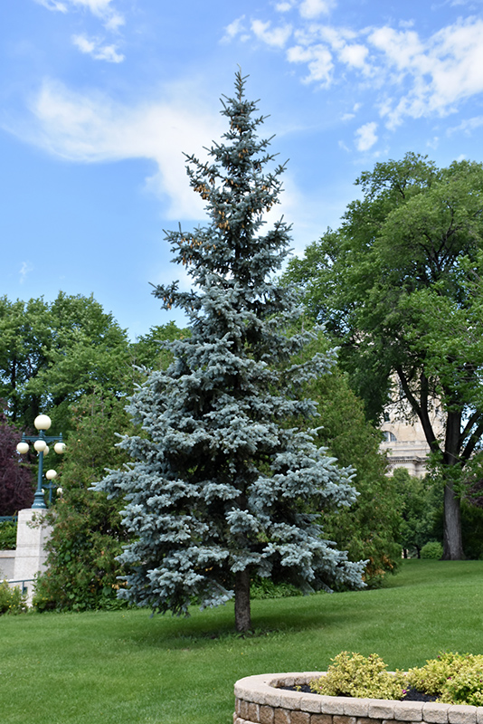 Blue Colorado Spruce is primarily valued in the landscape for its distinctively pyramidal habit of growth. It has attractive bluish-green evergreen foliage which emerges blue in spring. The needles are highly ornamental and remain bluish-green throughout the winter. The rough gray bark adds an interesting dimension to the landscape.