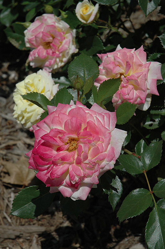 A brilliantly colored variety producing blooms that are butter yellow in the center, surrounded by flashes of white and pink edges; very disease resistant; outstanding in the garden or along borders