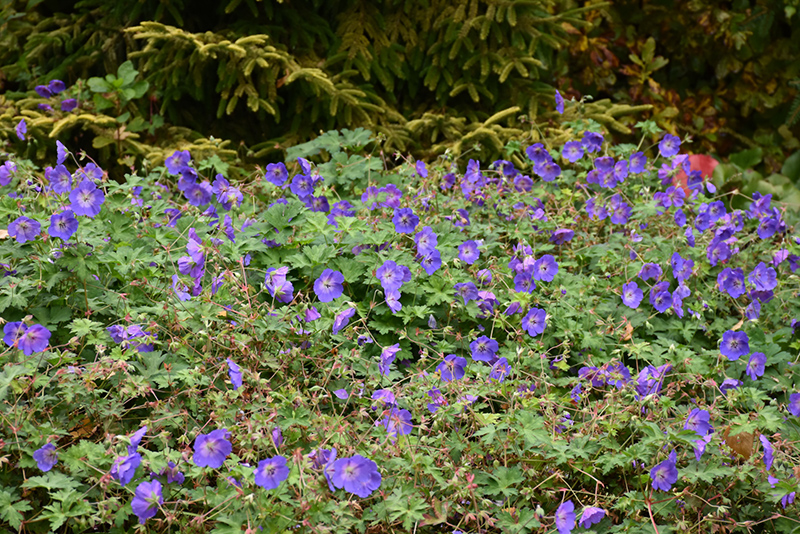 Rozanne Cranesbill will grow to be about 18 inches tall at maturity, with a spread of 24 inches. When grown in masses or used as a bedding plant, individual plants should be spaced approximately 20 inches apart. Its foliage tends to remain dense right to the ground, not requiring facer plants in front. It grows at a medium rate, and under ideal conditions can be expected to live for approximately 10 years. As an herbaceous perennial, this plant will usually die back to the crown each winter, and will regrow from the base each spring. Be careful not to disturb the crown in late winter when it may not be readily seen!