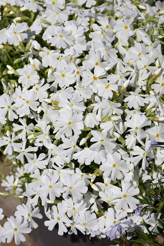 Spring White Moss Phlox is smothered in stunning white star-shaped flowers with gold eyes at the ends of the stems in late spring. Its tiny needle-like leaves remain forest green in color throughout the year.