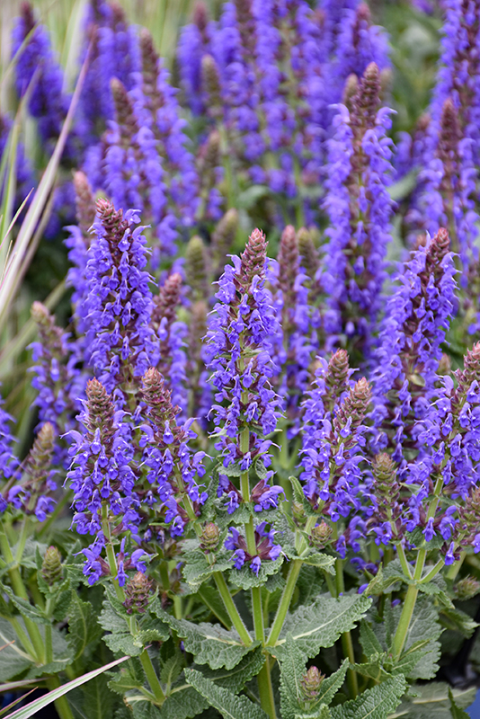 Sallyrosa™ April Night Meadow Sage has masses of beautiful spikes of blue flowers with violet overtones and brick red calyces rising above the foliage from mid spring to early fall, which emerge from distinctive purple flower buds, and which are most effective when planted in groupings. The flowers are excellent for cutting. Its fragrant narrow leaves remain grayish green in color throughout the season.