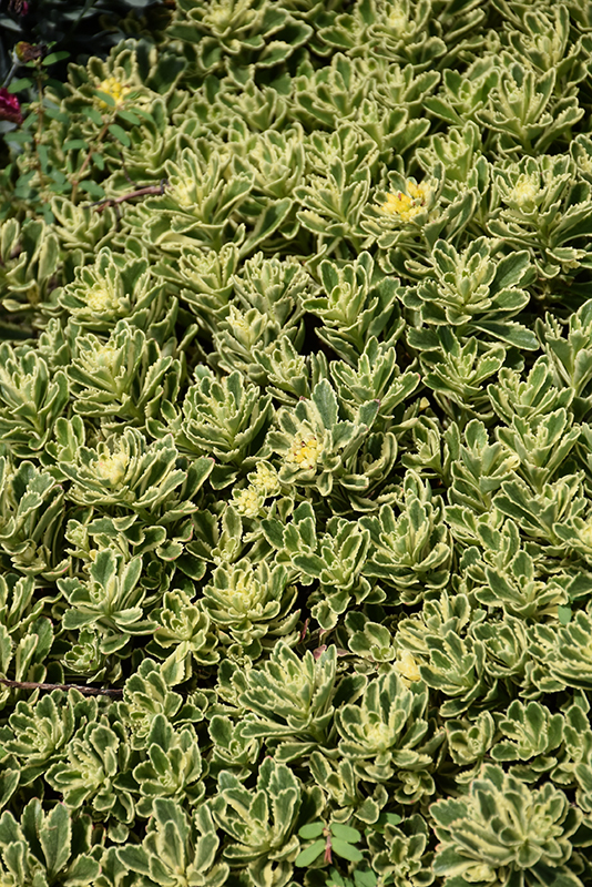 A low, groundcover stonecrop with beautiful green and cream variegation; yellow flowers in early summer are an added bonus; a drought-tolerant perennial that does best in poor soils, and an excellent choice for summer color in the garden