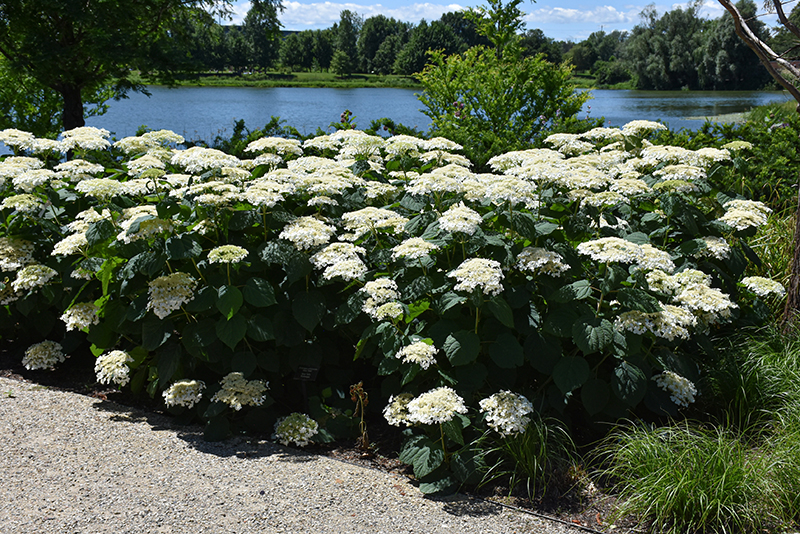 This elegant selection features huge, white lacecap blooms in early summer, lasting for a long time on strong, erect stems; attractive bluish-green foliage; tolerant of drought, heat and humidity; late winter pruning promotes more blooms on new growth