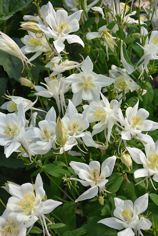 Showy, white flowers with yellow anthers and long, graceful spurs, rise on short, slender stems; long lasting as cut flowers; plants are well mounded with a controlled habit; good for naturalizing partially shaded areas