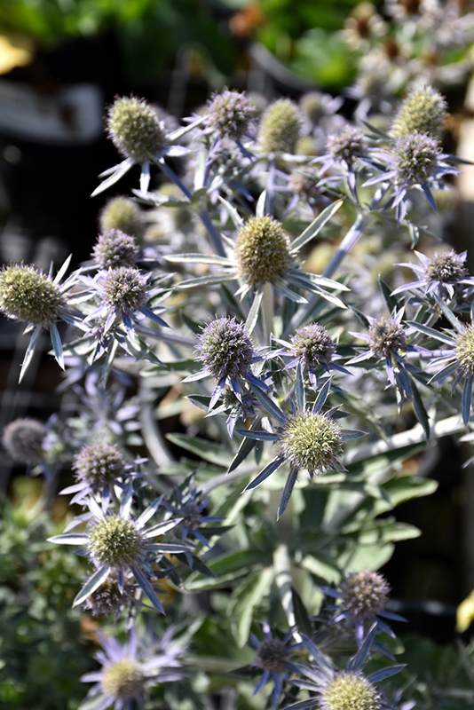 Blue Hobbit Sea Holly will grow to be about 12 inches tall at maturity extending to 18 inches tall with the flowers, with a spread of 12 inches. When grown in masses or used as a bedding plant, individual plants should be spaced approximately 10 inches apart. Its foliage tends to remain dense right to the ground, not requiring facer plants in front. It grows at a medium rate, and under ideal conditions can be expected to live for approximately 10 years. As an herbaceous perennial, this plant will usually die back to the crown each winter, and will regrow from the base each spring. Be careful not to disturb the crown in late winter when it may not be readily seen!