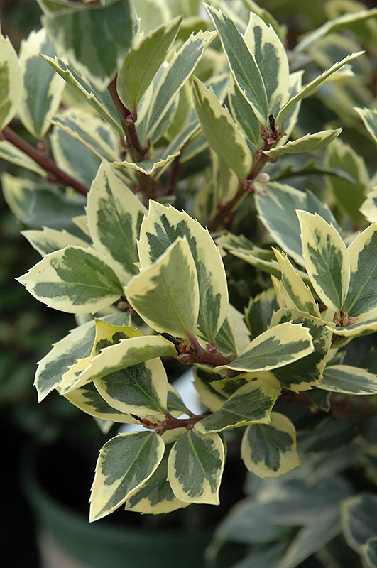 One of the hardiest of the evergreen hollies, this is a large, spreading shrub with attractive spiny blue-green foliage with cream edges; showy red berries in winter; requires a male plant within 100 feet